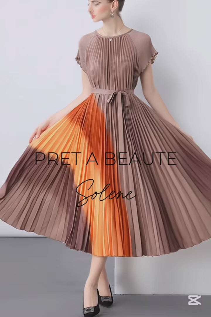 Das Solene Kleid besticht durch sein verspieltes und dennoch elegantes Design. Es zeichnet sich durch markante Plisseefalten, einen Taillengürtel und eine Midi-Länge aus, die Bewegung und Weiblichkeit unterstreichen. Der Multicolor-Effekt sorgt für einen dynamischen, zugleich harmonischen Look.