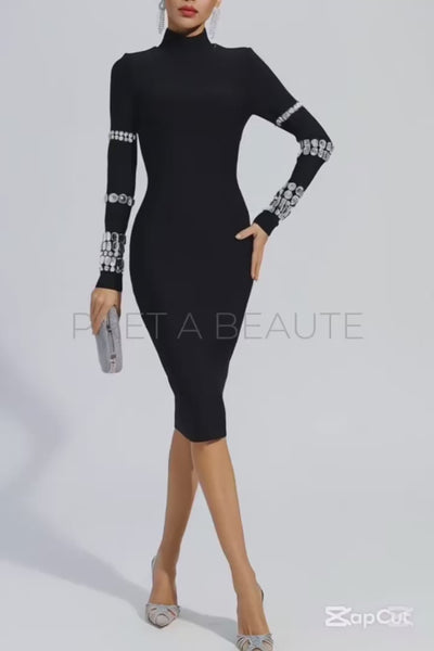 Stunning black dress by Diane Ford. The Coronia dress has a high neckline, long sleeves and is decorated with crystals on the sleeves. It is fastened with a zipper. Please refer to the size chart below for the correct size selection.
