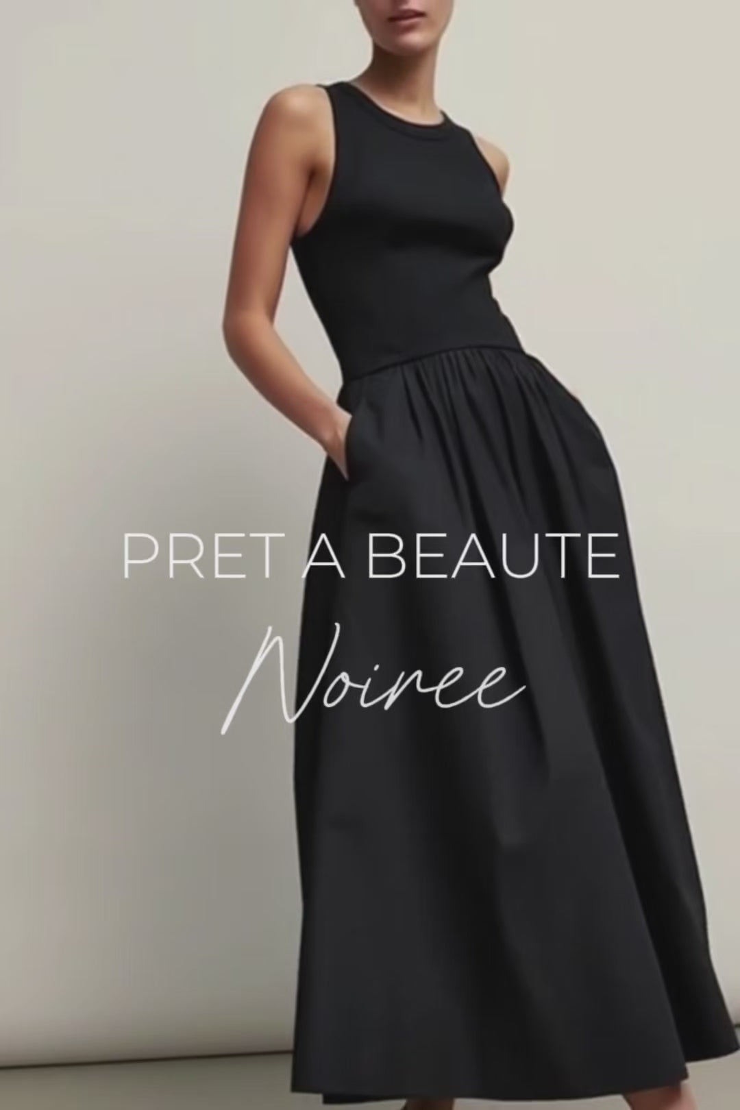 Αμάνικο μαύρο φόρεμα σε συνδυασμό jersey και poplin, με καθαρές γραμμές και ανάλαφρη σιλουέτα. Το εφαρμοστό μπούστο αγκαλιάζει το σώμα, ενώ η midi φούστα με διακριτική σούρα δημιουργεί φυσική κίνηση και κομψότητα σε κάθε βήμα. Από το πρωί μέχρι το βράδυ, παραμένει πάντα διαχρονικό και ευέλικτο. To μαύρο χρώμα του το καθιστά ιδανική επιλογή από το πρωί ως το βράδυ.