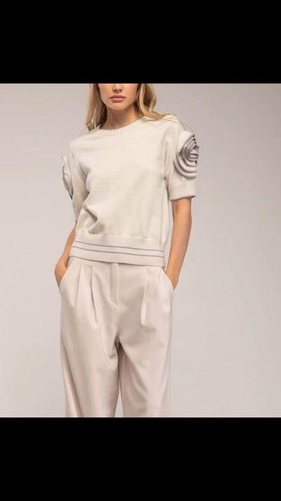 Το πλεκτό μπλουζάκι Florisse ξεχωρίζει για τη θηλυκή του λεπτομέρεια και τη διακριτική κομψότητά του. Τα λουλούδια στα μανίκια και οι λεπτές αντιθέσεις στα τελειώματα χαρίζουν έναν μοντέρνο, ρομαντικό χαρακτήρα. Η απαλή υφή του και η άνετη εφαρμογή το καθιστούν ιδανική επιλογή για πρωινές ή απογευματινές εμφανίσεις.
