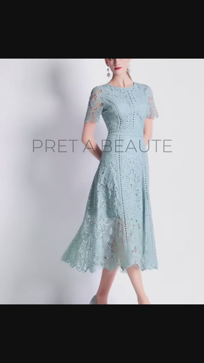 Κομψό φόρεμα φτιαγμένο από δαντέλα σε απαλό βεραμάν. Το φόρεμα Zelvina διαθέτει κοντά μανίκια και στρογγυλή λαιμόκοψη. Ιδιαίτερα εντυπωσιακό, θα προσθέσει γοητεία και στυλ σε κάθε σας εμφάνιση. Συμβουλευθείτε τον πίνακα μεγεθών πιο κάτω για σωστή επιλογή μεγέθους.